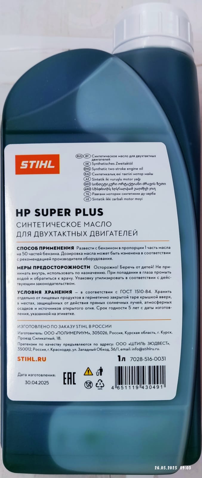 Масло для 2-х тактных двигателей синтетическое HP SUPER PLUS Stihl 1 литр